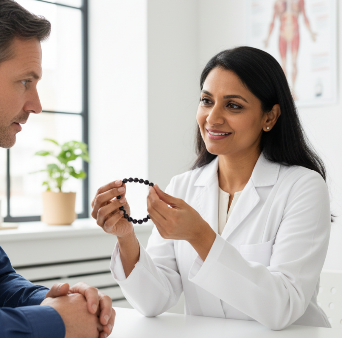 One-size design fits any wrist. Looks like jewelry, works like medicine. Discreet enough for daily wear.